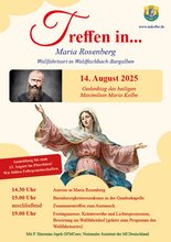Um 14.30 Uhr treffen wir uns auf dem Rosenberg um dann um 15.00 Uhr den Barmherzigkeitsrosenkranz in der Gnadenkapelle zu beten. Anschließend möchten wir uns zum Austausch zusammenfinden und schließlich um 19.00 Uhr die Festtagsmesse mit Kräuterweihe und Lichterprozession auf dem Rosenberg mitzufeiern. Nach der Heiligen Messe ergeht noch die Einladung zu der Bewirtung im Wallfahrtshof, die im Rahmen des Festprogrammes des Wallfahrtsortes stattfindet