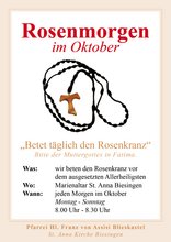 "Betet täglich den Rosenkranz." Dieser Bitte der Muttergottes in Fatima möchten wir auch in diesem Jahr nachkommen. Wir beten täglich den Rosenkranz in St. Anna Biesingen, Montag bis Sonntag, 8.00 Uhr bis 8.30 Uhr.