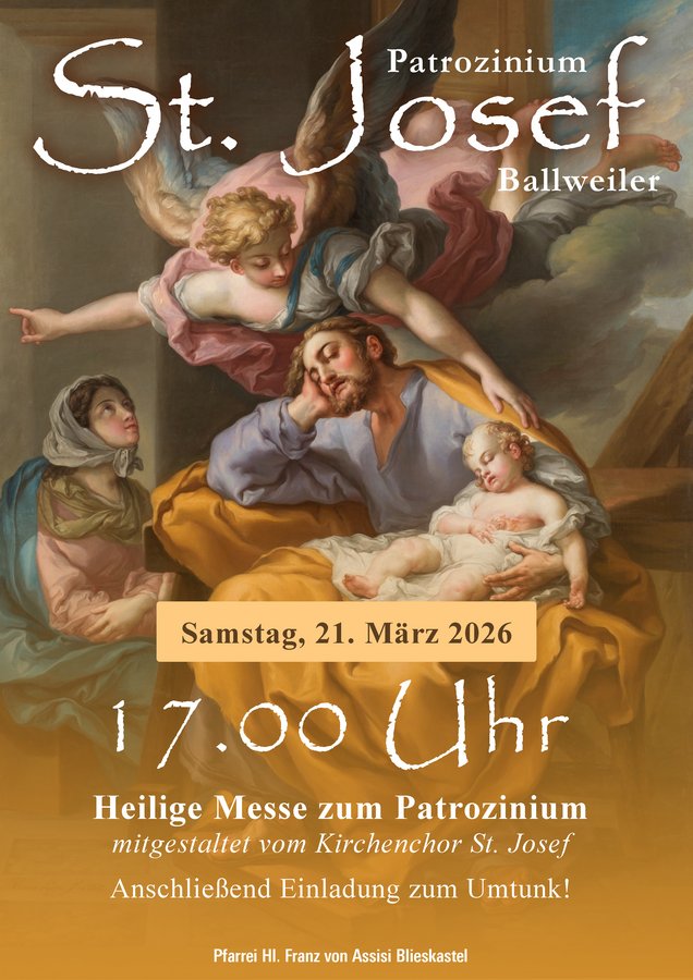 Wir freuen uns eine Josefkirche zu unserer Pfarrei zählen zu können und laden ganz herzlich am Samstag, dem 21. März, um 17 Uhr, zum Patroziniumsfest in Ballweiler ein. Die Heilige Messe wird vom Kirchenchor St. Josef musikalisch umrahmt und im Anschluss freuen wir uns auf einen gemeinsamen Umtrunk.