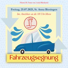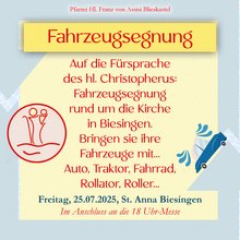 Bringen sie am Freitag, dem 25.07.2025, ihre Fahrzeuge mit, ob Auto, Traktor, Fahrrad, Rollator, Roller... P. Hieronim spendet den Segen im Anschluss an die 18 Uhr-Messe rund um die Kirche.