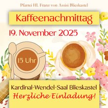 Herzliche Einladung zum Kaffeenachmittag am Mittwoch, dem 19. November 2025, um 15 Uhr, im Kardinal-Wendel-Saal des Pfarrzentrums Blieskastel.