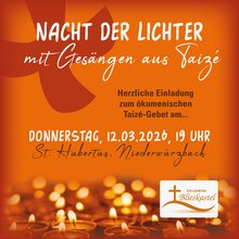 Herzliche Einladung zu unserem monatlichen, ökumenischen Taizé-Gebet in Blieskastel-Mitte und den anliegenden Gemeinden. Am Donnerstag, dem 12. März laden um 19 Uhr in die Kirche St. Hubertus in Niederwürzbach ein. Wir freuen uns auf das gemeinsame Gebet.