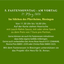 Herzliche Einladung am Samstag, dem 21. März 2026, zum dritten Fastenessen in unserer Pfarrei. An diesem Samstag laden wir ins Sälchen des Pfarrheims Biesingen ein.