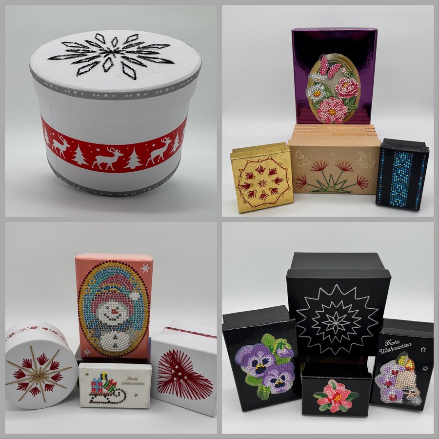 Mit Schablonen aus Plastik werden aus Karton, Tonpapier und Design-Elementen kleine Schachteln, Boxen und vieles mehr hergestellt.