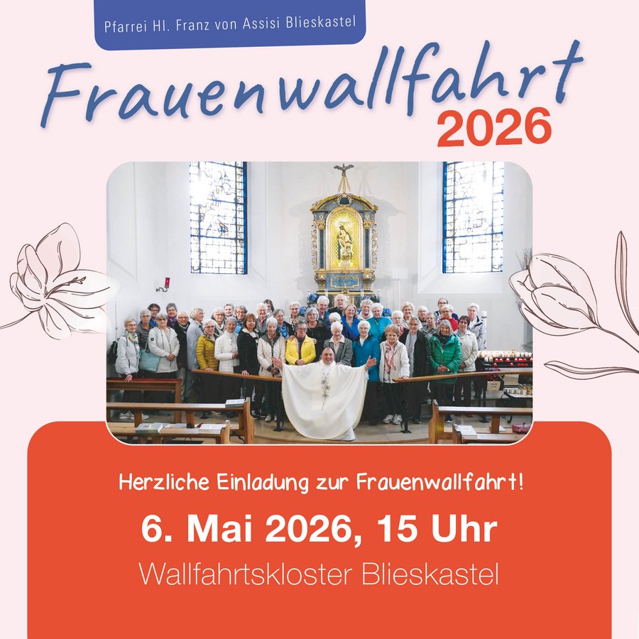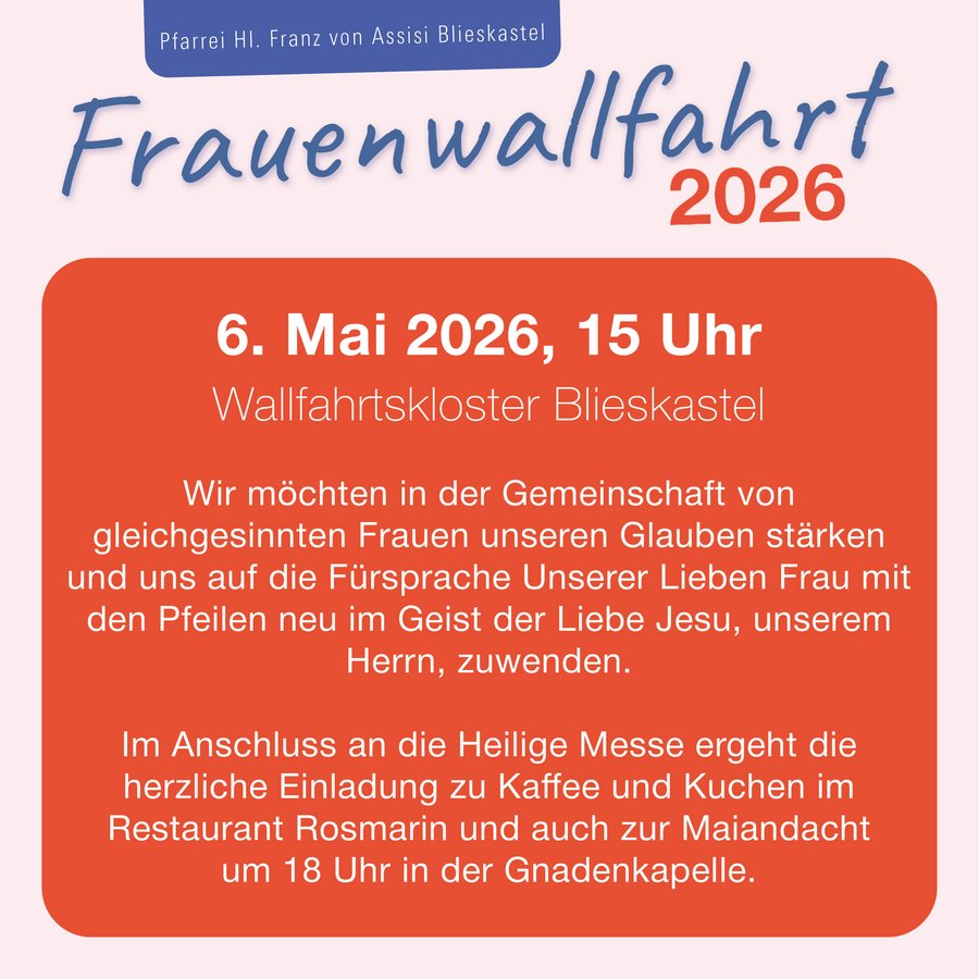 Am Mittwoch, dem 6. Mai 2026, laden wir ganz herzlich um 15 Uhr zur Heiligen Messe ans Wallfahrtskloster Blieskastel ein. Wir möchten in der Gemeinschaft von gleichgesinnten Frauen unseren Glauben stärken und uns auf die Fürsprache Unserer Lieben Frau mit den Pfeilen neu im Geist der Liebe Jesu, unserem Herrn, zuwenden.