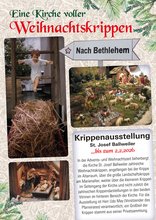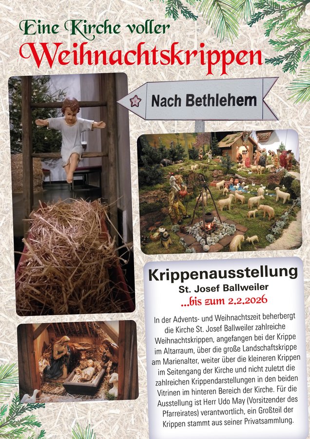 Ein ganz besonderes Angebot finden sie in St. Josef Ballweiler mit der Krippenausstellung von Herrn Udo May, dem Vorsitzenden des Pfarreirates. Er zeigt Weihnachtskrippen aus aller Welt und aus verschiedenen Jahrhunderten, von der Nussschalenkrippe über die sogenannten „Arme Leute Krippen“ bis hin zur großen Weihnachtskrippe im Chorraum von St. Josef.