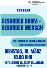 Herzliche EInladung zu einem Vortrag der KEB über die Gesundheit des Darms am Dienstag, dem 10. März, um 18 Uhr, in St. Josef Ballweiler. Referentin ist Frau Laval-Armand.