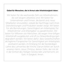 die seit langem arbeitslos sind. Wir beten für Unternehmen und Firmen, die bereit sind, neue Mitarbeiter einzustellen, sobald die Nachfrage nach ihren Dienstleistungen und Produkten wieder steigt. Wir beten für alle Bemühungen, Gerechtigkeit am Arbeitsplatz für Arbeitnehmer und Arbeitgeber zu gewährleisten. Wir beten für Millionen von Menschen, die wegen ihrer billigen Arbeitskraft ausgebeutet und oft zu Sklavenbedingungen degradiert werden. Wir beten dafür, dass Gewerkschaften als legitime Fürsprecher für Gerechtigkeit am Arbeitsplatz anerkannt werden, im Einklang mit der beständigen Lehre des Lehramtes der Kirche. Darum bitten wir durch unseren Herrn Jesus Christus, deinen Sohn, der mit dir in der Einheit des Heiligen Geistes lebt und herrscht, ein Gott, in Ewigkeit. Amen.