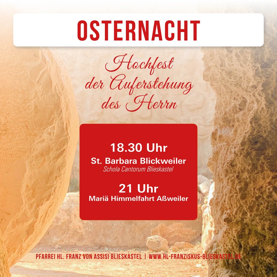 - 18.30 Uhr, Blickweiler, Heilige Messe zur Osternacht (Schola Cantorum Blieskastel)