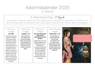 Für die Adventszeit möchten wir ihnen Woche für Woche einen Adventskalender zur Verfügung stellen, den sie sich leicht zuhause ausdrucken können. Um den Kalender druckerfreundlich zu halten ist er ganz einfach gestaltet. Wir wünschen eine segensreiche Adventszeit.