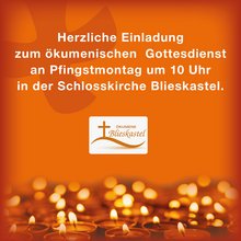 In dem Bewusstsein der gemeinsamen Berufung in der Wahrheit des Heiligen Geistes laden wir in Blieskastel ganz herzlich zum ökumenischen Gottesdienst an Pfingstmontag um 10 Uhr in die Schlosskirche Blieskastel ein.