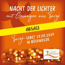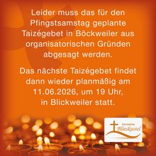 Das für Pfingstsamstag geplante Taizé-Gebet in Böckweiler muss leider aus organisatorischen Gründen abgesagt werden. Das nächste Taizé-Gebet findet dann wieder planmäßig am 11.06.2026, um 19 Uhr, in Blickweiler statt.