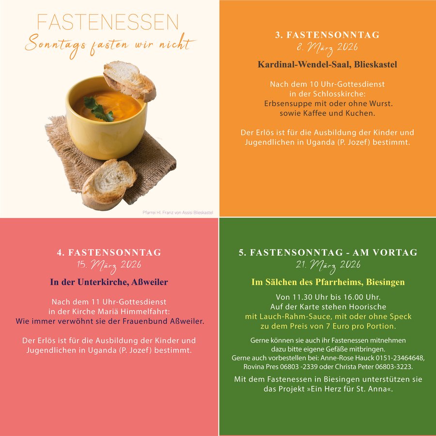 Gerne können sie auch ihr Fastenessen mitnehmen dazu bitte eigene Gefäße mitbringen. Gerne auch vorbestellen bei: Anne-Rose Hauck 0151-23464648, Rovina Pres 06803 -2339 oder Christa Peter 06803-3223.