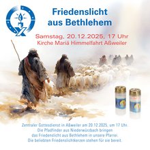 Eine ganz herzliche Einladung zum zentralen Gottesdienst am Samstag, 20.12.2025, 17 Uhr, in der Kirche Mariä Himmelfahrt Aßweiler. Die Pfadfinder aus Niederwürzbach bringen das Friedenslicht aus Bethlehem in diese Heilige Messe. Die beliebten Friedenslichtkerzen stehen für sie bereit.