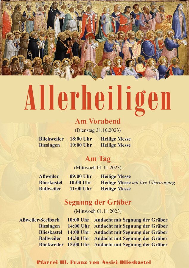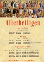 Allerheiligen ist das Fest ALLER Heiligen im Himmel. Damit sind die Heiligen gemeint, die von der Kirche als heilige Männer und Frauen anerkannt sind, und auch die, die uns unbekannt sind.