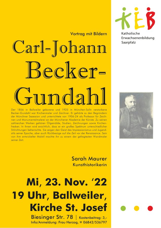 Zu einem Vortrag und Gespräch über „Carl Johann Becker-Gundahl“ lädt die Katholische Erwachsenenbildung Saarpfalz (KEB) am Mittwoch, den 23. November, um 19 Uhr in die Katholische Kirche St. Josef, nach Blieskastel-Ballweiler ein. Referentin ist die Kunsthistorikerin Sarah Maurer.